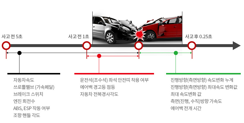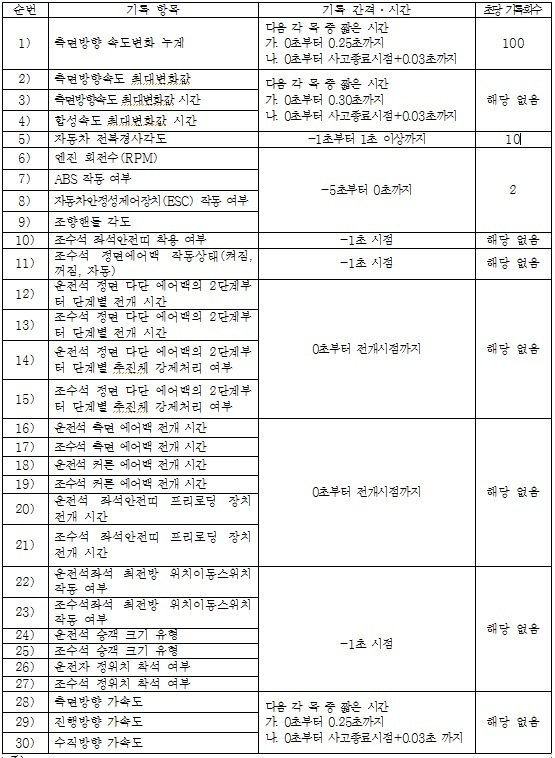 차량속도, 충돌시 속도변화, 제동 작동 여부(ON/OFF), 스로틀밸브 열림량 또는 가속페달 변위량, 에어백 경고등 작동여부, 에어백 전개시간 등 입니다. 필수 항목 15개, 선택항목 30개 항목으로 이루어져 있다. 상세한 내용은 관련 법규를 확인해보길 바란다.