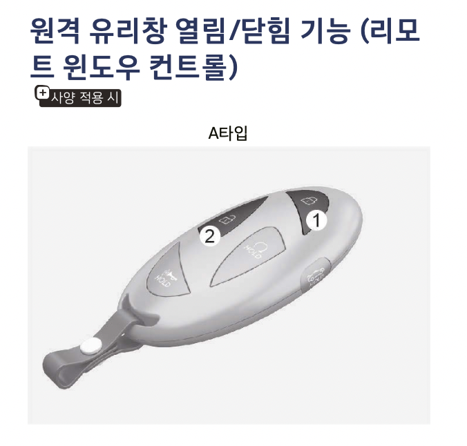 원격 유리창 닫음/열림 기능으로 유리창을 열거나 닫는 동안 작동거리가 변하면 유리창 동작이 멈출 수 있다. 충분히 가까운 위치에서 조작해야 한다