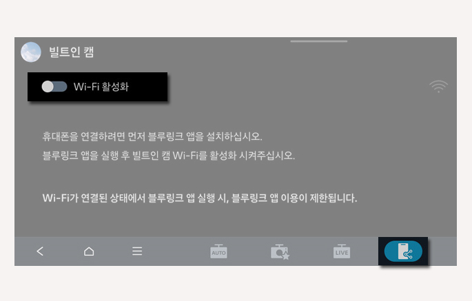 빌트인 캠2는 블루링크 앱을 반드시 설치해야 한다 인포테인먼트 시스템에서 빌트인 캠 설정 > 앱 연결 > 빌트인 캠 Wi-Fi 활성화를 선택(활성화)한 후 비밀번호를 설정자세한 설명은 '앱 연결 설정하기'를 참고하십시오.스마트폰에서 블루링크 앱을 실행, 빌트인 캠 메뉴를 선택한다블루링크 앱에서 빌트인 캠 연결하기를 누르고, Wi-Fi 연결을 선택한다.스마트폰의 Wi-Fi 설정 화면에서 빌트인 캠 Wi-Fi 네트워크 이름을 선택한 후 비밀번호를 입력하고 연결을 완료한다.빌트인 캠 Wi-Fi에 최초 연결할 때 비밀번호를 설정해야 합니다(숫자, 문자, 특수문자 포함 10자 이상).빌트인 캠의 Wi-Fi 네트워크 이름은 인포테인먼트 시스템의 안내 화면에 표시됩니다.스마트폰을 빌트인 캠 Wi-Fi에 연결하면 모..